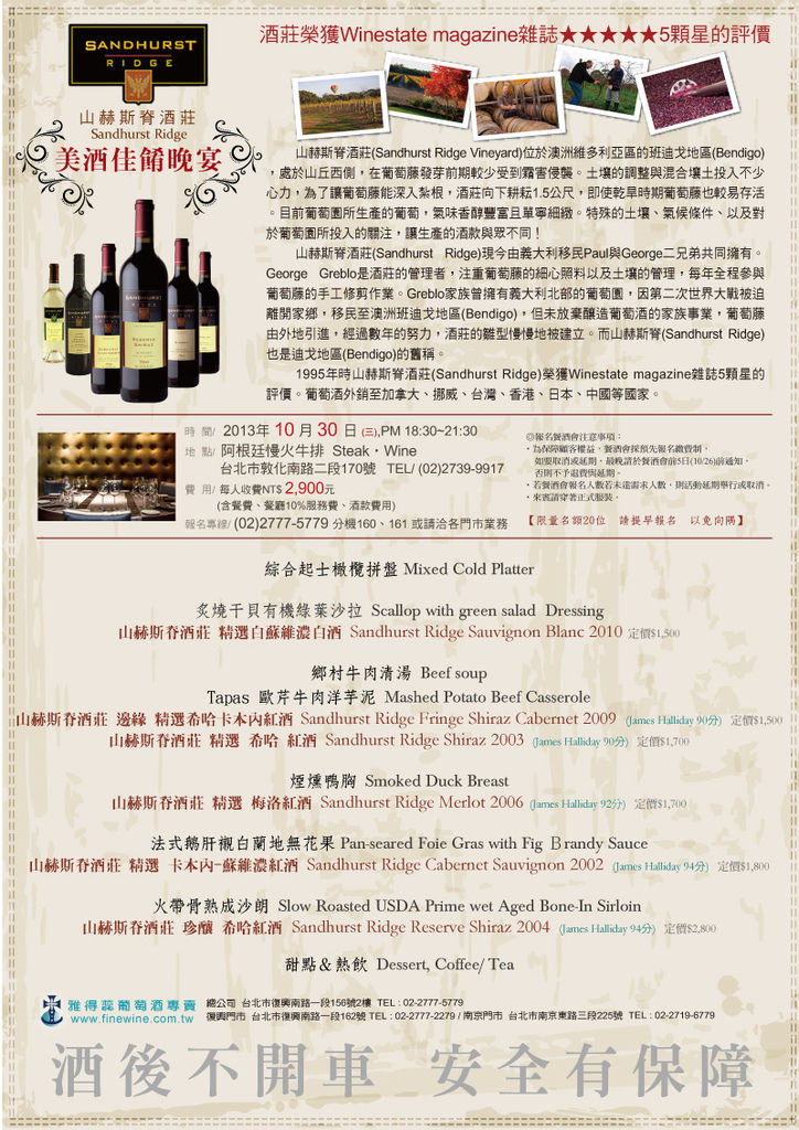 ‧為保障顧客權益,餐酒會採預先報名繳費制,如要取消或延期,最晚請於餐酒會前5日(10/26)前通知,否則不予退費與延期。