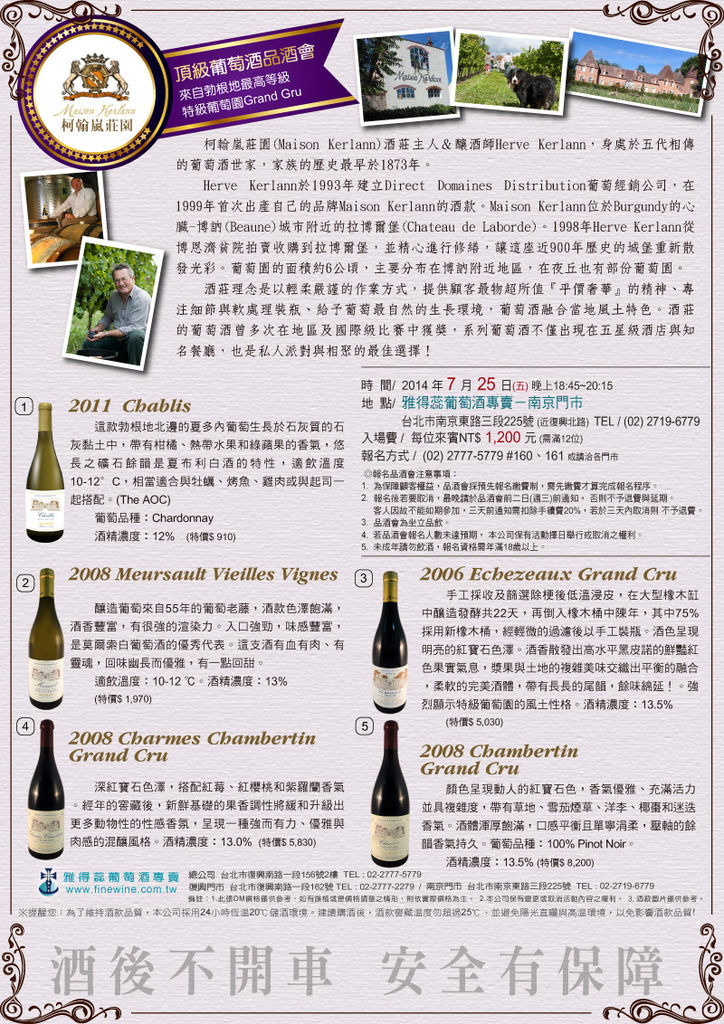 法國勃根地柯翰嵐莊園Maison Kerlann頂級葡萄酒品酒會品飲酒款
